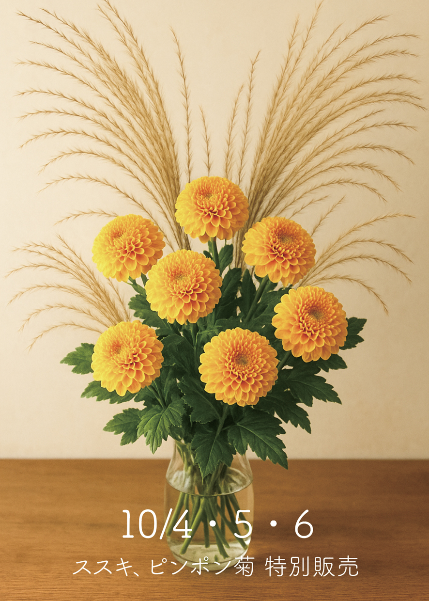 トップページ お知らせ・新着情報 一覧 ススキ・ピンポン菊 特別販売 ススキ・ピンポン菊 特別販売 【10月6日は 十五夜】 アイ・フラワー各店舗では10月4日(土)からの3日間、ススキとピンポン菊を特別販売いたします。 ススキは稲穂の代わりや魔除けとして飾られ、月の神様をお迎えする花ともいわれています。 秋のお花と一緒にススキを飾って、月見団子を囲みながら、ご家族や大切な方とゆったり日本の伝統を楽しんでみませんか? 投稿日:2025年09月25日